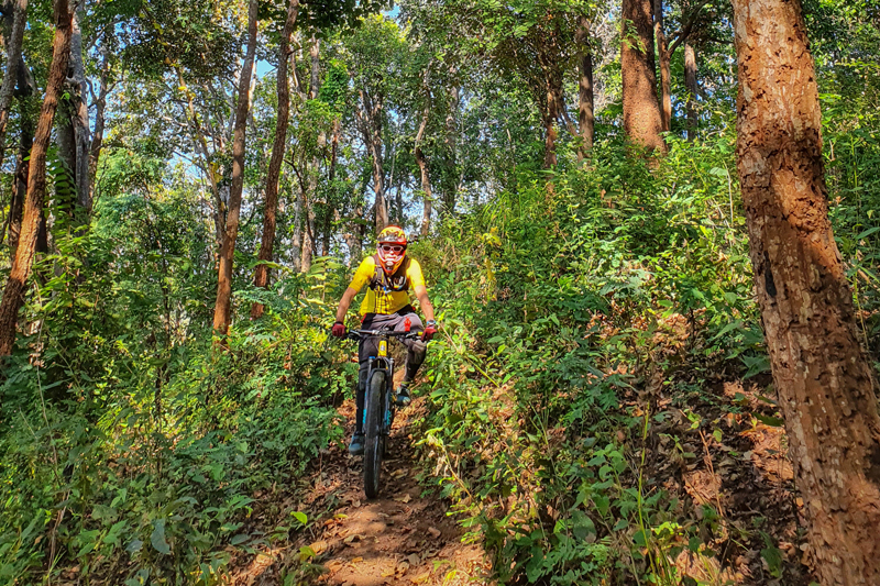We begin the tour with a 90-minute drive East of Chiang Mai, driving high up in Mae Takhrai National Park to the mountainous border between Chiang Mai and Lampang provinces. From here we ride through beautiful old growth forest at an elevation of 1000m+ along undulating smooth singletrack, following the mountain ridgeline. Along the way you’ll have sneak peak views of Chiang Mai on the right, Lampang on the left through the forest and they’ll be amazing sections of singletrack downhill / punchy climbs for the first few km.
